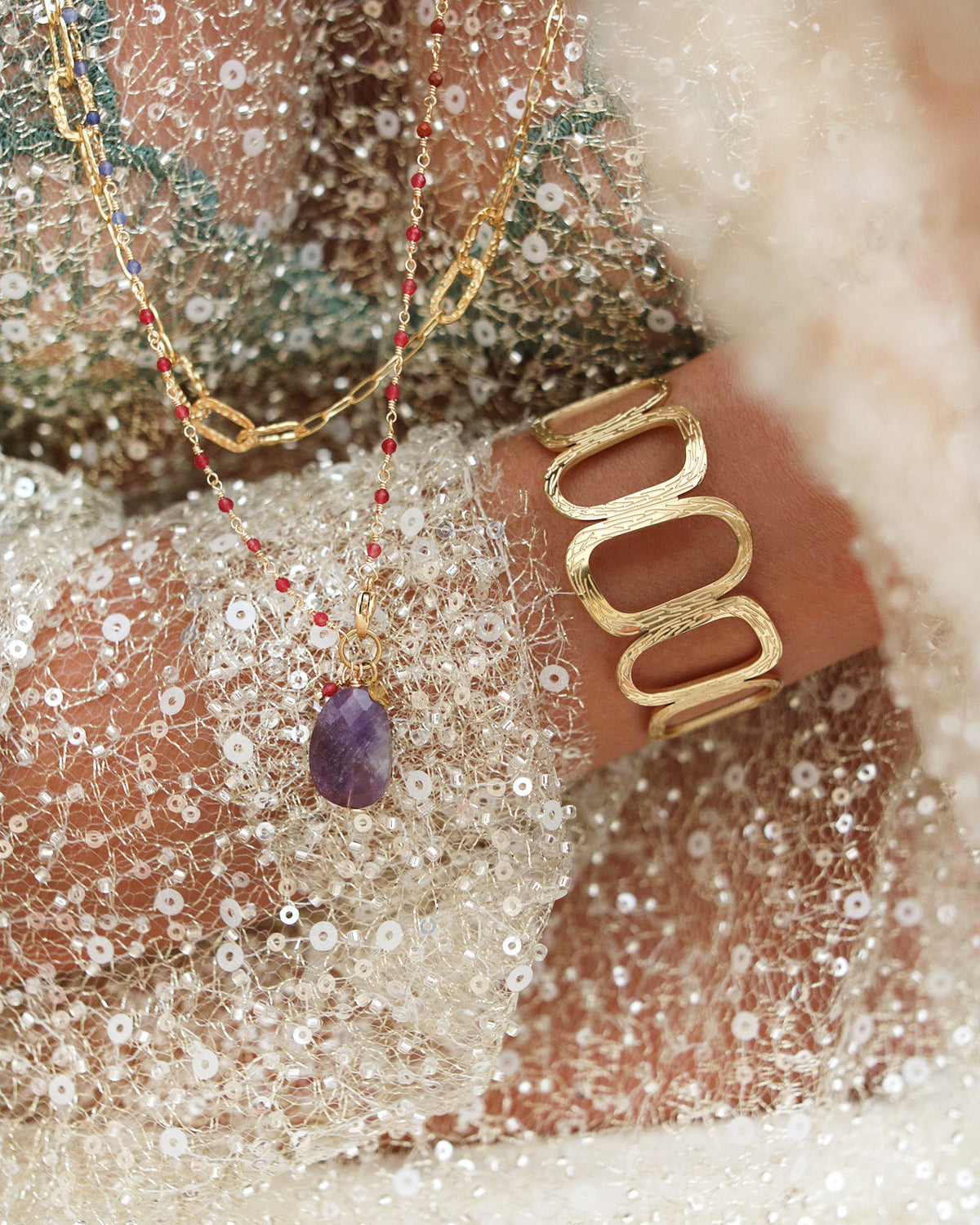 Sur la première photo portée, le mannequin porte également les sautoirs Neela et Kali